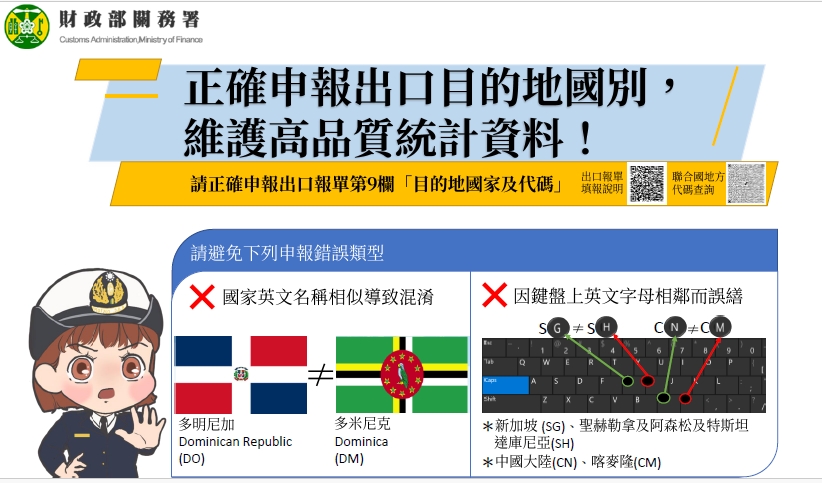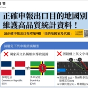 近年來全球經貿局勢瞬息萬變,為掌握我國與其他區域經濟體之貿易概況與趨勢,必須仰賴按國別統計之出口貿易資料,更是政府對外經貿談判之重要參考資訊。為維護貿易統計資料品質,關務署籲請業者正確申報出口「目的地國家及代碼」。